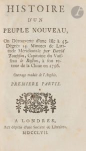 TOMPSON (David). — Histoire d’un peuple nouveau, Ou Découverte d’une isle à 43 Degrés 14 Minutes de Latitude Méridionale par David Tompson, Capitaine du Vaisseau le Boston, à son retour de Chine en 1756. — Londres : Aux dépens d’une...