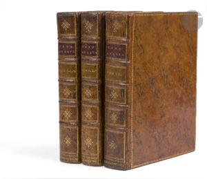Léger accroc sur le premier plat du dernier volume. Dans le même volume on note des restaurations au bas des premiers feuillets et une déchirure sans manque dans la marge du feuillet Ddddd3.