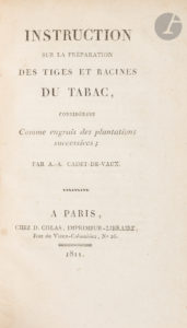 CADET DE VAUX (Antoine Alexis François). — Instruction sur la préparation des tiges et racines du tabac, considérées Comme engrais des plantations successives. — Paris : D. Colas, 1811. —Plaquette in-12, 172x103 : (1 f.), 26 pp.