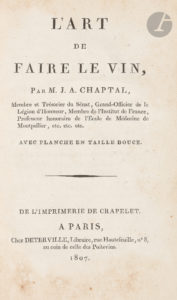 CHAPTAL (Jean-Antoine). — L’Art de faire le vin. — Paris : Deterville, 1807. — In-8, 199x124 : xix, 382 pp., 1 planche.