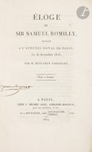Édition originale de cet éloge de l’homme politique anglais Samuel Romilly (1757-1818), prononcé au lycée de l’Athénée royal de Paris.