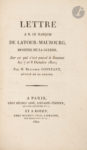 - Lettre à M. le Marquis de Latour-Maubourg, ministre de la guerre, Sur ce qui s’est passé à Saumur les 7 et 8 Octobre 1820. Paris: Béchet aîné; Rouen: Béchet fils, 1820. — In-8, 205x130: 22 pp., (1 f.), couverture muette.