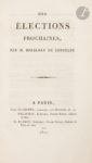 - Des élections prochaines. Paris: Plancher, Delaunay, Hubert, 1817. — In-8, 212x133: (2 ff.), 64 pp., couverture muette.