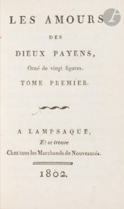 [CURIOSA]. — Les Amours des dieux payens. — Lampsaque : chez tous les Marchands de Nouveautés, 1802. — 2 tomes en un volume in-18, 131x82 : (2 ff.), 106 pp., 9 planches; (2 ff.), 107 pp., 11 planches.