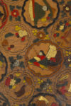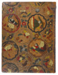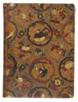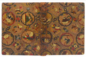 Papier cuir gaufré orné en continu sur les plats et le dos d’un décor japonisant doré et en couleurs composé de compartiments de fleurs et de personnages, dos lisse, doublures et gardes de papier gaufré, tête dorée, non rogné, couverture conservée, étui (reliure de l’époque).