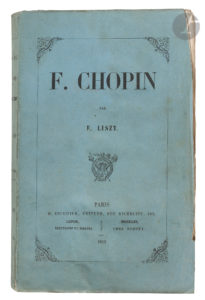 LISZT (Franz). — F. Chopin. — Paris : M. Escudier; Leipzig : Breitkoff et Hartel ; Bruxelles : Schott, 1852. —In-8, 225x141 : (2 ff.), 206 pp., (1 f.), couverture imprimée.