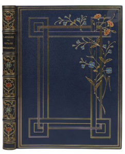 Maroquin bleu foncé, double encadrement de filets dorés droits et entrelacés sur les plats, fleurs dorées et mosaïquées s’enroulant autour du cadre intérieur du premier plat, dos à nerfs orné, de médaillons ovales dorés et ornés de fleurs dorées et mosaïquées, encadrement de maroquin bleu foncé à l’intérieur, orné de filets dorés et d’un fleuron doré aux angles, doublures et gardes de soie bordeaux, doubles gardes, tranches dorées sur témoins, couverture conservée (Marius Michel).