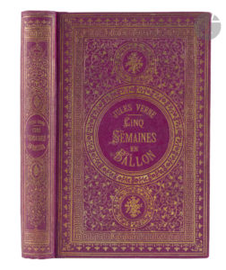 VERNE (Jules). — Cinq semaines en ballon. — Voyage de découvertes en Afrique par trois anglais. — Paris : Bibliothèque d’éducation et de récréation, J. Hetzel, [1866]. — Petit in-8, 234x150 : frontispice, (2 ff.), 370 pp., (1 f.), 23...