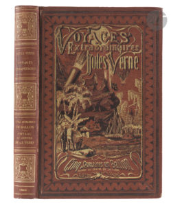VERNE (Jules). — Cinq semaines en ballon. — Voyage de découvertes en Afrique par trois anglais. — Voyage au centre de la Terre. — Paris : Bibliothèque d’éducation et de récréation, J. Hetzel et Cie, 1872. — In-8 double, 268x174 : (2...