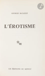 BATAILLE (Georges). — L’Érotisme. — Paris : Éditions de Minuit, [1957]. —In-8, 225x140 : 306 pp., (3 ff.), 20 planches, couverture imprimée.
