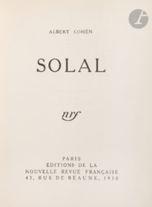 COHEN (Albert). — Solal. — Paris : Nouvelle Revue Française, 1930. — In-4, 219x166 : 350 pp., (1 f.), couverture imprimée.