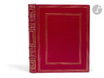 Maroquin rouge, double encadrement de deux filets dorés sur les plats, dos à nerfs orné, maroquin rouge en encadrement à l’intérieur, orné de 5 filets dorés, doublures de soie moirée jaune bordée d’un filet doré, gardes de soie moirée jaune, tranches dorées sur témoins, couverture et dos conservés, étui (Ch. Septier).