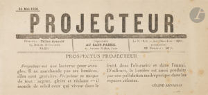 [REVUE] - ARNAULD (Céline). — Projecteur. — Paris : Au Sans Pareil 21 mai 1920. — Brochure in-8 oblong, 106x229 : (6 ff.). Agrafée.