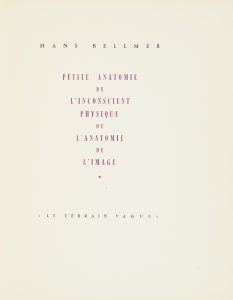 Bellmer Hans. Anatomie de l’image. Paris, Le Terrain Vague, 1957. 228 x 185 mm, br. Edition originale. Frontispice et 9 dessins reproduits de Hans Bellmer. Ex. sur papier Neige du Marais, tirage total à 1016 ex.
