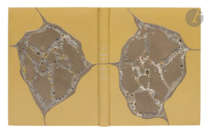 Box kaki, plats ornés d’une composition abstraite en relief faite de pièces irrégulières de box vert olive sur fond de papier caillouté, dos lisse orné d’une bande de box vert olive joignant les compositions des plats, doublures et gardes de daim vert foncé, non rogné, couverture et dos conservés, chemise à dos et bandes à recouvrement de box kaki, étui bordé assorti (C. et J.-P. Miguet 1988).