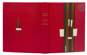 Chagrin rouge, premier plat orné d’un jeu de larges bandes verticales de chagrin noir, bordeaux et bronze sur lesquelles sont collées 6 pièces de galuchat blanc, second plat orné de trois pièces de chagrin noir, bronze et bordeaux surmontées d’une pièce de galuchat blanc, dos lisse, doublures et gardes de daim gris, non rogné, couverture et dos conservés, chemise à dos de chagrin rouge, étui bordé (N. Berjon, 2020).