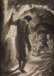 - un très beau dessin original au lavis, au format du livre, signé par l’artiste, représentant Macbeth entrant dans la caverne des sorcières,