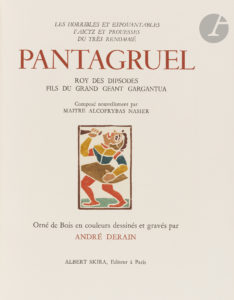 Cette édition est d’autant plus importante qu’elle est hors norme. «En 1941, répondant à la commande par Albert Skira d’une illustration en couleurs de Pantagruel, André Derain choisit de revenir à la gravure sur bois des débuts de l’imprimerie, quand le trait des imagiers ne retenait que l’essentiel. Pour en ranimer l’esprit, il fallait en réinventer les conditions simples. Derain réserva donc la gouge au tracé des formes, confiant aux surfaces intouchées le soin de porter les couleurs. Pour l’impression de planches aussi inhabituelles, on préféra à une imprimerie xylographique l’atelier de taille-douce de Roger Lacourière, plus familier à l’éditeur et moins onéreux. La tâche confiée à quatre étudiants dirigés par Jacques Frélaut consistait à peindre chaque planche selon le modèle fourni par Derain en employant un mélange d’encre à l’eau et d’essence de térébenthine, à imprimer d’un coup, à nettoyer la surface du bois et à recommencer pour l’épreuve suivante. Au début, celles-ci gardèrent le «peigné» des coups de pinceaux, puis Achille Weber, le collaborateur de Skira qui avait la haute main sur ces opérations, demanda qu’on lissât les couleurs afin d’ôter les marques de ces interventions manuelles qui se renouvelèrent pour plus de cinquante-huit mille épreuves pendant trois ans, de 1942 au début de 1945» (Antoine Coron, in: Des livres rares depuis l’invention de l’imprimerie, pp. 270-271, n°221).