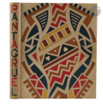 Maroquin beige, plats entièrement recouverts d’un riche décor mosaïqué de box bleu foncé, havane, rouge et ocre, souligné par des filets dorés, représentant au centre une sorte d’amphore composée d’éléments géométriques (rectangles, triangles au centre avec carreaux et cœur ajourés) et de zigzags, bordée à gauche et à droite de compositions symétriques, dos lisse orné du titre du livre en long en caractères majuscules mosaïqués de box rouge et bleu foncé, doublures de daim vert olive bordé d’un listel de box vert foncé, gardes de même daim, tranches dorées sur témoins, couverture et dos conservés, chemise à dos à bandes à rabats de maroquin noir, étui bordé (Creuzevault).
