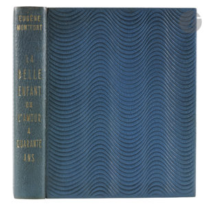Maroquin bleu, plats ornés d’un décor en relief composé d’une succession de filets ondulés horizontaux parallèles en creux, symbolisant des vagues, dos lisse, encadrement de maroquin bleu orné d’un filet noir à l’intérieur et bordé d’un listel de maroquin beige, doublures et gardes de lin, tranches dorées sur témoins, couverture et dos conservés, chemise à dos et bandes à rabats de maroquin noir, étui (Creuzevault).