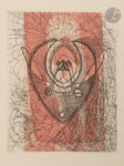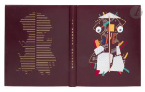 Box bordeaux, premier plat orné d’un personnage abstrait fait de filets dorés et au palladium, de petites pastilles de mêmes couleurs, ainsi que de pièces mosaïquées de box rouge, vert, jaune, orange, ocre, blanc, gris et noir, et de papiers brillants et holographiques, second plat orné de filets dorés horizontaux représentant la forme du personnage du premier plat, dos lisse, doublures et gardes de daim gris, tête dorée, non rogné, couverture et dos conservés, chemise à dos et bandes à recouvrement de box bordeaux, étui bordé (M. Richard, 1991).