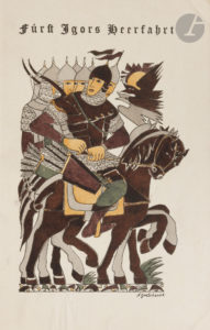 Très belle édition tirée à 700 exemplaires, de la traduction allemande d’Arthur Lüther du poème épique Slovo o plŭku Igorievě (Le Dit de la Campagne d’Igor) considéré comme la plus ancienne œuvre littéraire des slaves orientaux, rédigé à la fin du XIIe siècle. Il relate la campagne militaire perdue menée en 1185 par le prince Igor Sviatoslavitch contre les Coumans de Kontchak.