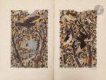 Cartonnage d’éditeur demi-parchemin à la Bradel à petits coins, premier plat illustré d’une composition de Gontcharova, dos lisse.