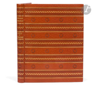 Maroquin fauve, plats ornés d’un décor à répétition alternant horizontalement 2 filets dorés, 2 filets à froid, une frise de petits carrés dorés, une ligne de 4 soleils à froid, ce décor en continu sur le dos lisse, doublures et gardes de daim brun foncé, tranches dorées sur témoins, couverture et dos conservés, chemise à dos et bandes à recouvrement de maroquin fauve, étui (Georges Cretté).