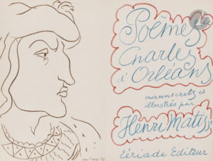 MATISSE (Henri). — Poèmes de Charles d’Orléans manuscrits et illustrés par Henri Matisse. — [Paris] : Tériade, [1950]. — In-folio, 410x266 : (2 ff. blancs), 100 pp., (4 ff. 2 derniers blancs), couverture illustrée.