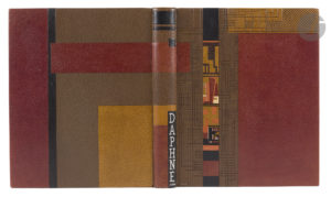 Maroquin marron châtaigne, décor dans le plus pur style Art déco composé sur le premier plat de larges bandes couvrant une partie du bord gauche et du bord supérieur, faites de maroquin brun et olive ornés de filets à froid parallèles ou en croisillon, une frise verticale sépare en deux la grande bande de maroquin brun, ornée de pièces de maroquin noir, brun, orange, olive, et beige, avec rehauts de filets au palladium, second plat orné de bandes et de pièces rectangulaires de maroquin noir et dans les tons marron, dos lisse orné de pièces de maroquin de différents tons, dont l’une porte la titre du livre en lettres capitales au palladium, encadrement de maroquin de différentes teintes à l’intérieur, doublures de soie brune bordée d’un listel de maroquin noir, gardes de même soie, couverture conservée (G. Cretté succ. de Marius Michel - F. L. S[chmied]).