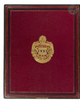 Maroquin bleu foncé janséniste, dos à nerfs, doublures de maroquin bordeaux orné d’un listel de maroquin aubergine et de trois filets dorés en encadrement, ainsi que des armes dorées et mosaïquées au centre, gardes de soie moirée bordeaux, doubles gardes, tranches dorées sur témoins, couverture et dos conservés, étui (P. Affolter - J. Augoyat suc.).