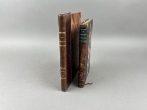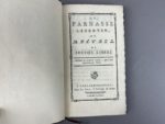 Collectif - Gill André Le parnasse libertin, ou recueil de poésies libres. A Paillardisoropolis, chez Le Dru, à l'enseigne de Priape, L'AN des plaisirs, (S.D. Circa 1780). 1 volume petit in-12, reliure XIXème en demi-basane bordeaux à coins, dos à nerfs, basane verte pour la pièce de titre, tête dorée. Frottements et épidermures, en particulier sur le dos. 2 ff.-188 pp. Bon exemplaire avec de jolies marges. Rare exemplaire de ce recueil qui fait partie des curiosas et de l'enfer de la BNF, condamné en 1852 par le tribunal correctionnel. Moins courant que l'édition de 1772 à la même adresse et plus intéressant car augmenté près de 70 pages et de 38 textes. On joint : La muse à bibi, suivie de l'art de se conduire dans la société des pauvres bougres par la comtesse de Rottenville. 1 volume in-12, reliure postérieure (1920), demi-basane bordeaux, dos lisse avec auteur et titre doré. Dos insolé, couverture conservée. 106 pp. Bon exemplaire, sans frontispice. Ouvrage de poésies caricaturales dû à André Gill, célèbre dessinateur et pamphlétaire des journaux, la lune ou l'éclipse.