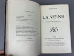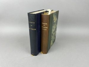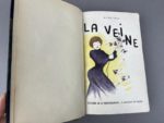 Grosclaude Les gaîtés de l'année. Librairie moderne, Paris, 1889. 1 volume in-12, reliure à la Bradel en demi-maroquin vert foncé à coins, dos lisse avec auteur, titre et date dorée, tête dorée. Couverture et témoins conservés, reliure de Stroobants. Dos insolé. Troisième année de cette parution illustrée par Job et Bac, celui-ci un des 10 exemplaires sur papier Japon porte le n° 1. Exemplaire enrichi de 11 feuillets manuscrits, non signés, vraisemblablement, une critique littéraire intitulée « causeries littéraires ». Feuillets montés sur onglet et reliés en début d'ouvrage. Exemplaire propre sans rousseur. On joint : La veine. Paris, éditions de la revue blanche, 1902. 1 volume in-12 d'Alfred Capus, reliure à la Bradel en demi-maroquin bleu foncé à coins, tête doré, couverture conservée, reliure de Champs. Un des 5 exemplaires du tirage de tête imprimé sur papier Japon. Très propre, sans rousseur, jolie couverture en couleurs réalisée par Cappiello.