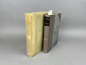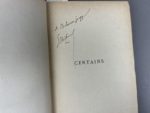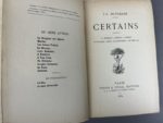 Huysmans Joris-Karl Certains. Chez Tresse & stock éditeurs, Paris 1889. 1 volume in-12, reliure d'époque à la Bradel en demi-basane grise à coins, dos lisse avec pièce de titre en maroquin noir, fleurons et date dorés. Relire signée Champs-Stroobants. Couverture conservée, rousseurs à celle-ci. Exemplaire du titrage courant, avec un envoi signé de l'auteur à Mr Lucien Gougy, libraire parisien. On joint du même auteur : La bièvre et Saint-Séverin, à Paris chez Stock, 1898. 1 volume in-12 broché à relier, couverture détachée et dos cassé. E.O., un des 40 exemplaires sur papier de Hollande, après seulement 13 sur Chine et 10 sur Japon, celui-ci porte le n° 15, à toutes marges sans rousseur.