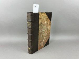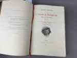 Rostand Edmond Cyrano de Bergerac. Paris, Armand Magnier, 1899. 1 volume in-4°, reliure en demi-maroquin chocolat à coins, dos à nerfs avec auteur, titre fer et date dorés, tête dorée. Couverture conservée. Très légers frottements d'usage, dos légèrement insolé. Feuillet bruni au recto du justificatif de tirage, quelques piqûres éparses, comme souvent, sur le papier de Chine, plus prononcées sur la tranche. Ex-libris de la famille Galand Béarn, fer frappé au dos représentant une vache, (Ollivier, Hermal, 2434). Un des 400 exemplaires sur papier vélin à la cuve avec 2 états des bois, 1 état avant la lettre sur papier de Chine et l'état avec lettre sur vélin.