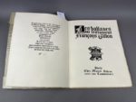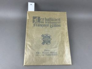 Villon François Les ballades du testament. Paris, Marcel Seheur, 1925. 1 volume in-4° broché, couverture rempliée. Edition imprimée en caractères gothiques ornés de gravures sur bois par Berdon. Tirage à 250 exemplaires, celui-ci porte le n° 119, impression sur vélin d'Arches au monogramme de l'éditeur.