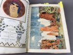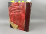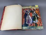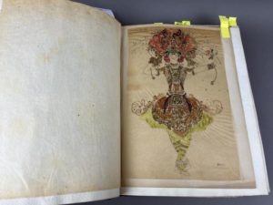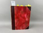 Collectif Les Ballets Russes 1 volume grand in-4°, reliure d'époque en demi-chagrin bordeaux à coins, dos à nerfs avec titres et petits fers dorés, ainsi qu'une danseuse stylisée en pointillés dorés. Frottements d'usage sur le cuir, le second plat très abîmé, déformé par l'humidité avec manque de papier. Album composite et unique composé de collages, reproductions, aquarelles, calques, découpages de programmes, revues, documentations... dont : 1- Comoedia Illustré : Mme Karsavina et Mr Bolm dans Thamar ; numéro enrichi d’un calque signé Bakst. 27 x 18 cm représentant Melle Karsavina dans "Oiseau de feu" 2- Aquarelle couleur non signée représentant une danseuse. Revue 7ème saison des ballets russes reproductions d'après Léon Bakst pour "Dieu Bleu". 3- Aquarelle non signée « Daphnis et Chloé, 2eme acte » d'après Bakst. 4- Aquarelle signée Bakst. 29 x 22 cm representant Nijinski dans l'après-midi d'un Faune 5- Après-midi d'un Faune. Calque signé Bakst et daté 1912. 24 x 16 cm. 6- Numéro de la revue Comoedia Illustré, numéro extraordinaire consacré aux Ballets russes. 7- Programme des Ballets russes Paris 1917, illustration de Picasso, Théâtre du Chatelet, Mai 1917. 8- Ballets russes 1919/1920 à l'Opéra. 9- Ballets russes de Serge de Diaghilew. Programme Gaité Lyrique, mai 1921. Contient une petite aquarelle d'après Picasso. 13 x 18 cm représentant un décor de théâtre. 10- Ballets russes à l'Opéra, Mai, Juin 1922 11- Ballets russes Gaité Lyrique 1923. 12- Grande Saison d'Art de la VIII Olympiade, Ballets russes de Serge de Diaghilew, Théâtre des Champs Elysées Mai Juin 1924 / avec Envoi « Pour Mon Cher Paul Francis Poulenc 51 » 13- 1925 Ballets Russes 1928, envoi du compositeur Henry Sauget « Pour Elsa et Paul Collaer en souvenir d'une amitié de trente ans...3/12/51 ». 14- Ballets russes 1928, envoi à Paul Collaer de Nicolas Nabokoff suit différents programmes avec deux ou trois découpes. Après quelques recherches, les envois sont vraisemblablement adressés à Paul Collaer et son épouse Elsa Meyer. Paul Collaer est un grand musicologue, pianiste et chef d'orchestre Belge. Très bel ensemble comprenant 3 originaux signés du grand peintre Léon Bakst.