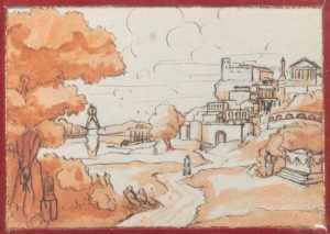 Ecole française du XVIIe siècle Paysage classique animé de personnages à l'antique avec une ville et un port Plume, encre brune et lavis de sanguine sur papier gris-bleu 21 x 31 cm