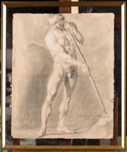 Pierre BELJAMBE (1759-circa 1820) Académie d’homme tenant un bâton Pierre noire, estompe et rehauts de craie blanche sur papier chamois (pliure et rousseurs) Annoté, signé et daté à la plume en bas à droite : « 1er prix d’après nature par Pierre Beljambe de Rouen 1776 » contresigné au verso en haut à gauche et daté « 1776 » en haut à droite 55 x 44,5 cm