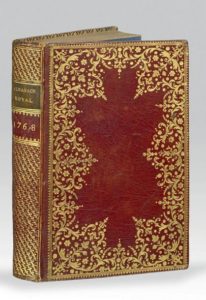 ALMANACH ROYAL, année bissextile 1768. — Paris, Le Breton, s.d. [1768]. — In-8, maroquin rouge, dentelle dorée aux petits fers, dos lisse orné à la grotesque, pièce de titre vert olive, roulette intérieure, doublure et gardes de tabis bleu,...