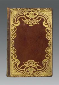 Reliure ornée d'une élégante plaque d'encadrement de Pierre-Paul Dubuisson, avec motif de toile d'araignée dans les angles (Rahir, n°184-g).