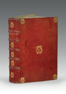 dorées au centre et aux angles des plats, dos à nerfs orné des mêmes pièces d’armes répétées, roulette intérieure, tranches dorées (Reliure de l'époque).