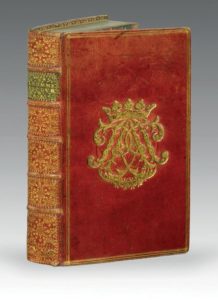 filet doré, grand chiffre couronné au centre des plats, dos richement orné, pièce de titre verte, roulette intérieure, tranches dorées sur marbrure (Reliure de l'époque).