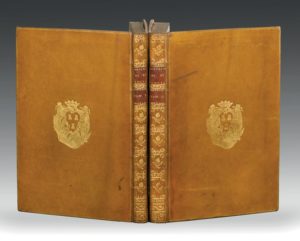 in-folio, maroquin citron, triple filet doré, armoiries au centre, dos lisse orné, pièces de titre et de tomaison fauve, roulette intérieure, tranches dorées (Reliure du XVIIIe siècle).