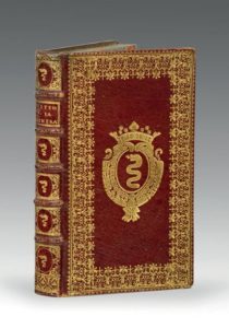 maroquin rouge, large dentelle droite, armoiries au centre, dos orné avec pièce d'armes (une couleuvre tortillée) répétée, roulette intérieure, tranches dorées sur marbrure (Reliure de l'époque).
