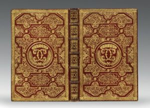 Très riche reliure à la fanfare, exécutée par un atelier non identifié, au décor organisé autour d’un compartiment circulaire dans lequel, est frappé un grand chiffre (un double C surmonté d’une couronne de roses et entouré de palmes dorées).