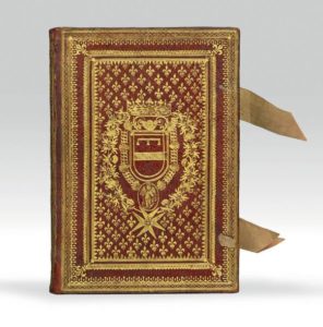 orné au centre de grandes armoiries et chargé d'un semé de fleurs de lis, restes de rubans de soie, dos lisse orné, tranches dorées (Reliure italienne de l'époque).