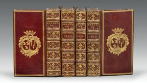 1759. — Ordonnance de Louis XIV. — Donnée à S. Germain en Laye au mois d'Avril 1667. — Ibid., 1760. — Ordonnance de Louis XIV […]. Pour le commerce. — Donnée à S. Germain en Laye au mois de Mars 1673. — Ibid., 1762. — Ordonnance de Louis XIV [...] sur le Fait des Eaux & Forêts, donnée à S. Germain en Laye au mois d'Août 1669. — Paris, Compagnie des Libraires associés, 1765. — Ensemble 4 volumes — In-12, maroquin rouge, triple filet doré, armoiries au centre, dos orné, roulette intérieure, tranches dorées (Reliure de l'époque).