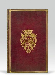 armoiries au centre, dos lisse orné, pièce de titre noire, roulette intérieure, doublure et gardes de soie moirée bleue, tranches dorées (Reliure de l'époque).
