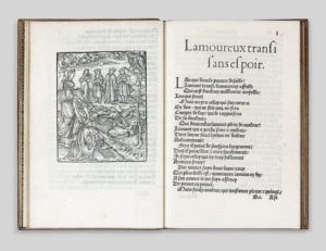 BOUCHET (Jean). Les Angoysses et remèdes damours. Du Traverser en son adolescence. On les vend à Poitiers au Pelican (à la fin:) Imprimé à Poitiers le huitième jour de janvier 1536 par Jehan et Enguibert de Marnef frères. In-4 gothique, maroq. rouge, dos à 5 nerfs avec fil. à froid, motif central aux petits fers, doubl. de maroq. bleu orné d’une dentelle, tr. dor (Rel. du XIXe siècle, non signée, mais de Duru). EDITION ORIGINALE de ce recueil formé d’élégies et de complaintes. Il est orné de deux marques différentes des Marnef (celle du titre est reproduite par Brunet I, 1162) et d’une grande figure allégorique signée de la Croix de Lorraine (R. Brun, p. 141) reproduite par Tchémerzine. Très bel exemplaire de cet ouvrage rare, dans une jolie reliure doublée. Ex-libris A. P. Garnier (vente 24 Oct. 1978, No 15 du cat.).